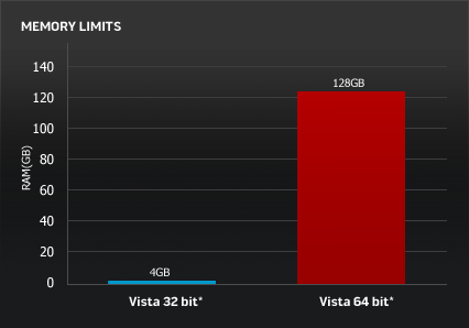 - mai multă memorie: posibilitatea folosirii a mai mult de 4GB de RAM (de fapt, a mai mult de 3.12 GB cât este maximul “văzut” de Windows-ul pe 32 de biţi) reprezintă un mare avantaj în cazul folosirii unor aplicaţii ce necesită multă memorie;